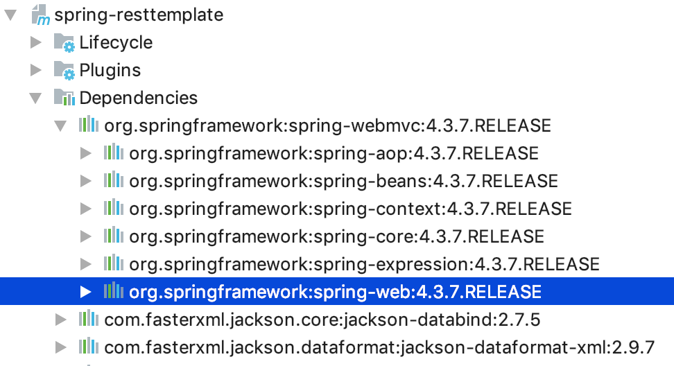 기본 스프링을 사용 중이라면 spring-webmvc 의존성만 추가하여 작업하시면 됩니다. 실제로 RestTemplate은 spring-web 의존성에 포함된 클래스이지만, spring-webmvc 의존성에 spring-web이 포함되어 있어 같이 의존성이 포함됩니다.
