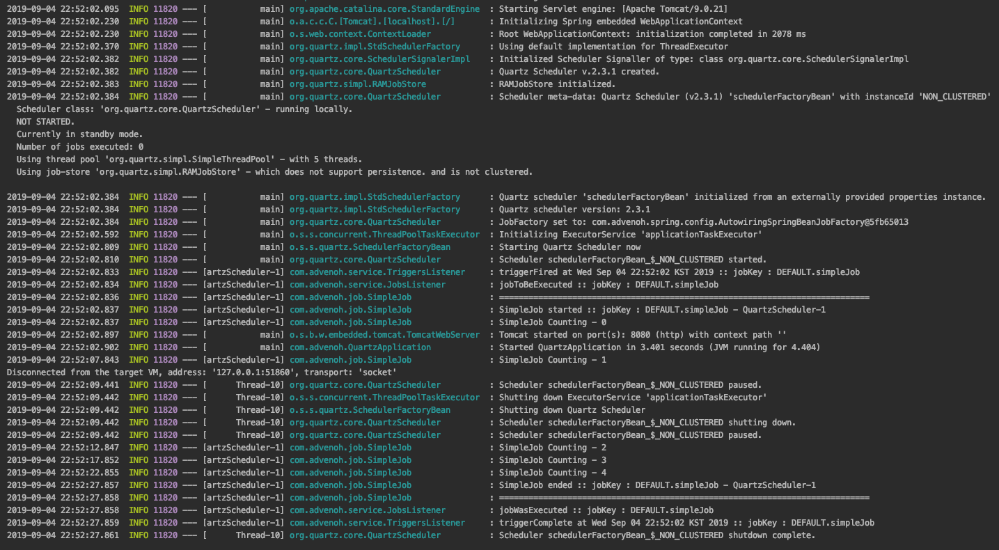 스프링 부트 구동시 콘솔에 찍히는 화면입니다. Quartz Scheduler가 초기화되고 시작된 이후에 추가하는 SimpleJob이 실행되는 것을 볼 수 있습니다.