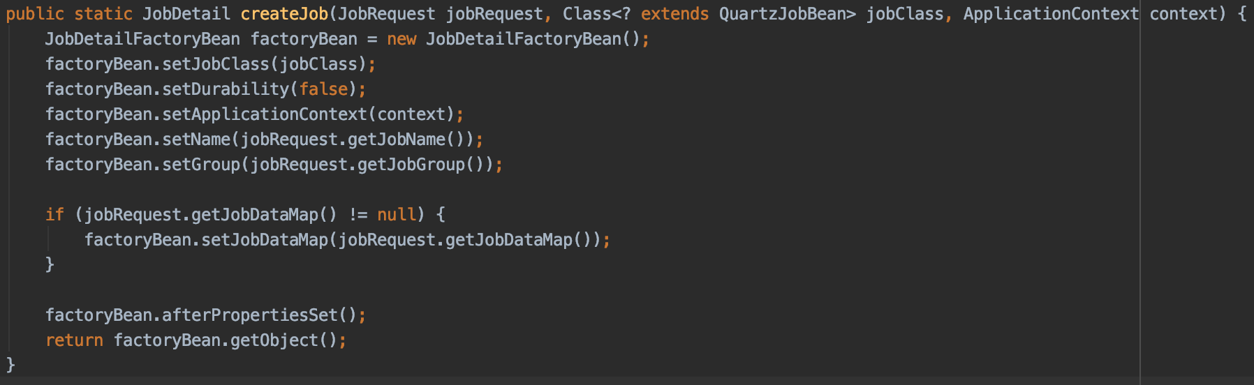 Quartz API에서 단 하나의 메서드를 가진 execute(JobExecutionContext context) Job 인터페이스를 제공한다. Quartz를 사용하는 개발자는 수행해야 하는 실제 작업을 이 메서드에서 구현하면 된다.