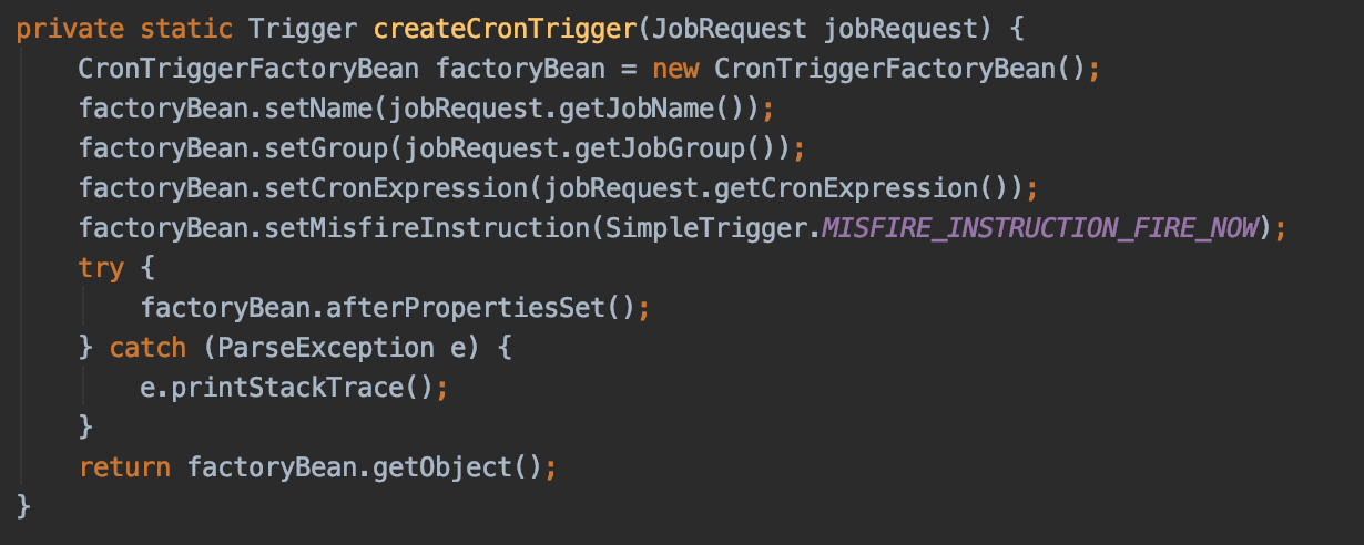 CronTrigger는 cron 표현식으로 Trigger를 정의하는 방식이다 (ex.매일 12시 - '0 0 12 * * ?’)